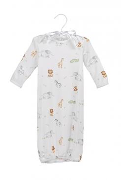 This sack gown features an all-over print of safari animals and coordinates with the Safari Animals Sock Collection. It is made of luxuriously soft bamboo rayon and comes on a white satin padded hanger.