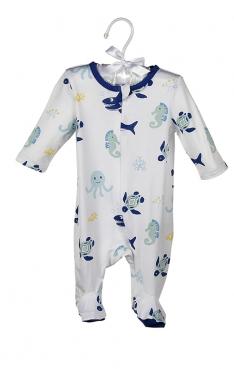 This beautiful footed playsuit features an exclusive all-over print of sharks, turtles, seahorses, and octopi in ocean blues and greens. It is made of luxurious bamboo blend rayon and is so very soft! There are snaps from neck to inseam for ease of changing.