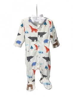 This beautiful footed playsuit has an exclusive woodland animal print and is made from luxurious bamboo blend rayon that is so very soft! Packaged on white satin hanger.