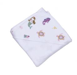 This hooded towel is a generous 35" square bath towel made from 100% cotton and features our exclusive sea life print of mermaids, sea horses, turtles, and fish in pretty pinks and purples. This coordinates with Sera the Seahorse and Maribel the Mermaid. It is beautifully folded and tied with a ribbon, ready for gifting!