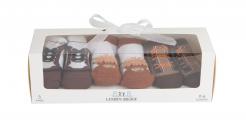 Our socks are made from 100% knitted cotton and sized to fit 0-6 months. Each gift set contains 3 pairs of coordinating socks, beautifully packaged in a box with a ribbon bow and ready to give as a gift! Sock pairs are also sold separately.