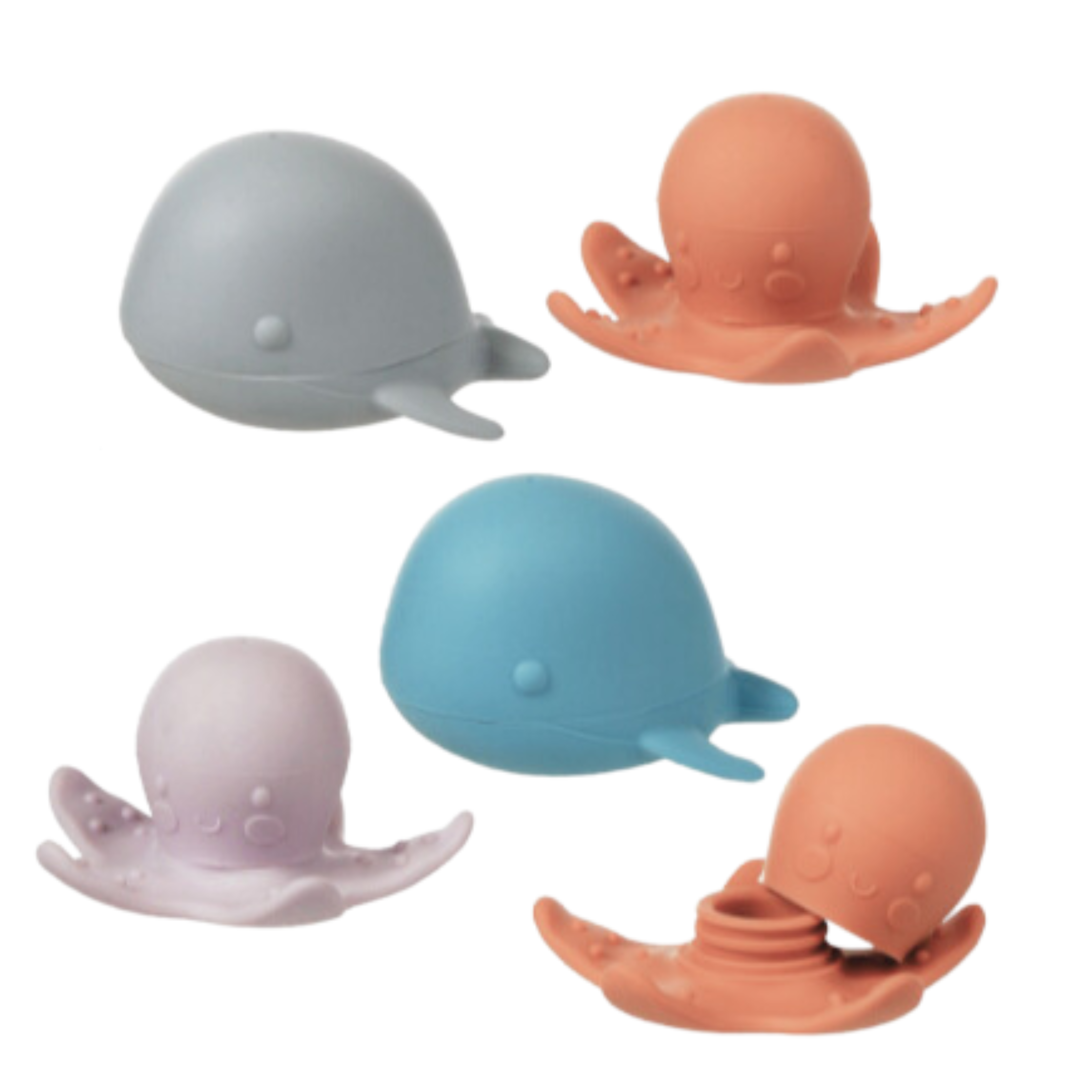 These silicone bath toys are ready for bath time fun! These bath toys come apart for easy cleaning!! What a great feature! Toys measure 4" to 4 1/2" tall. choose from whales or octopi